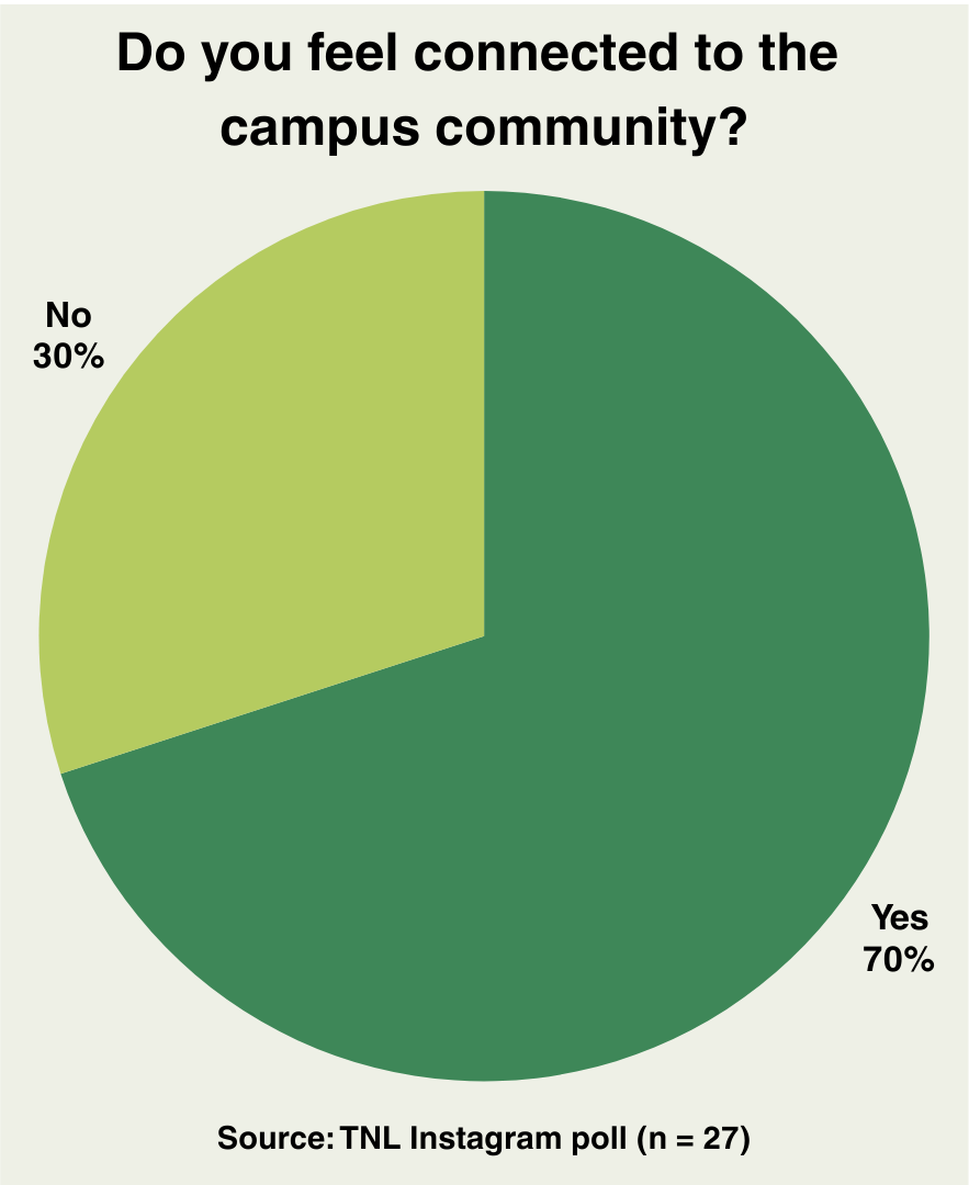 Results indicated that 70% of participants said they feel connected to the campus community, while 30% said they don’t. An overwhelming 88% of participants said they believe their degree will benefit them in the future.