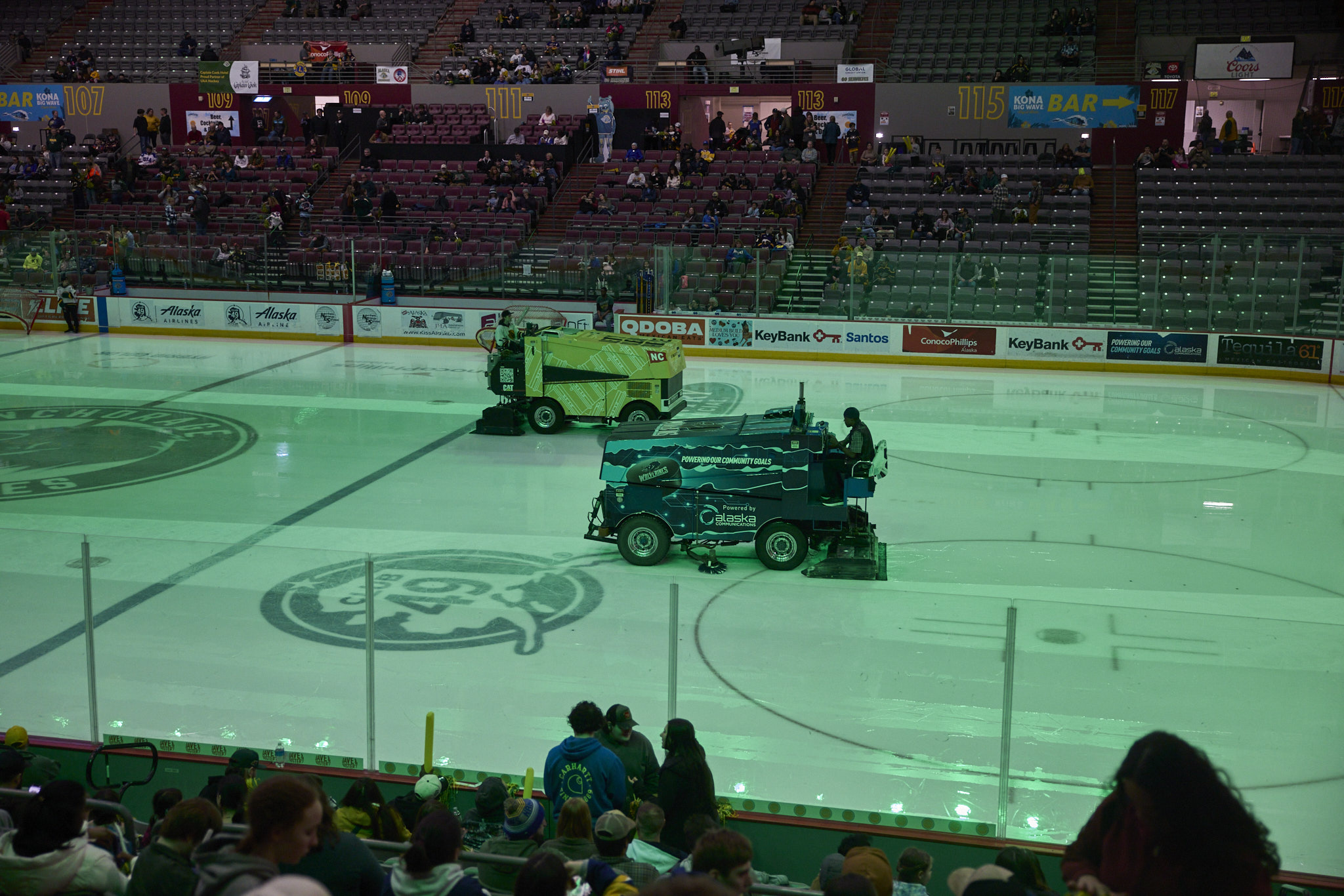 Two Zambonis smooth the ice after the teams finish warming up. Photo by Justin Cox.