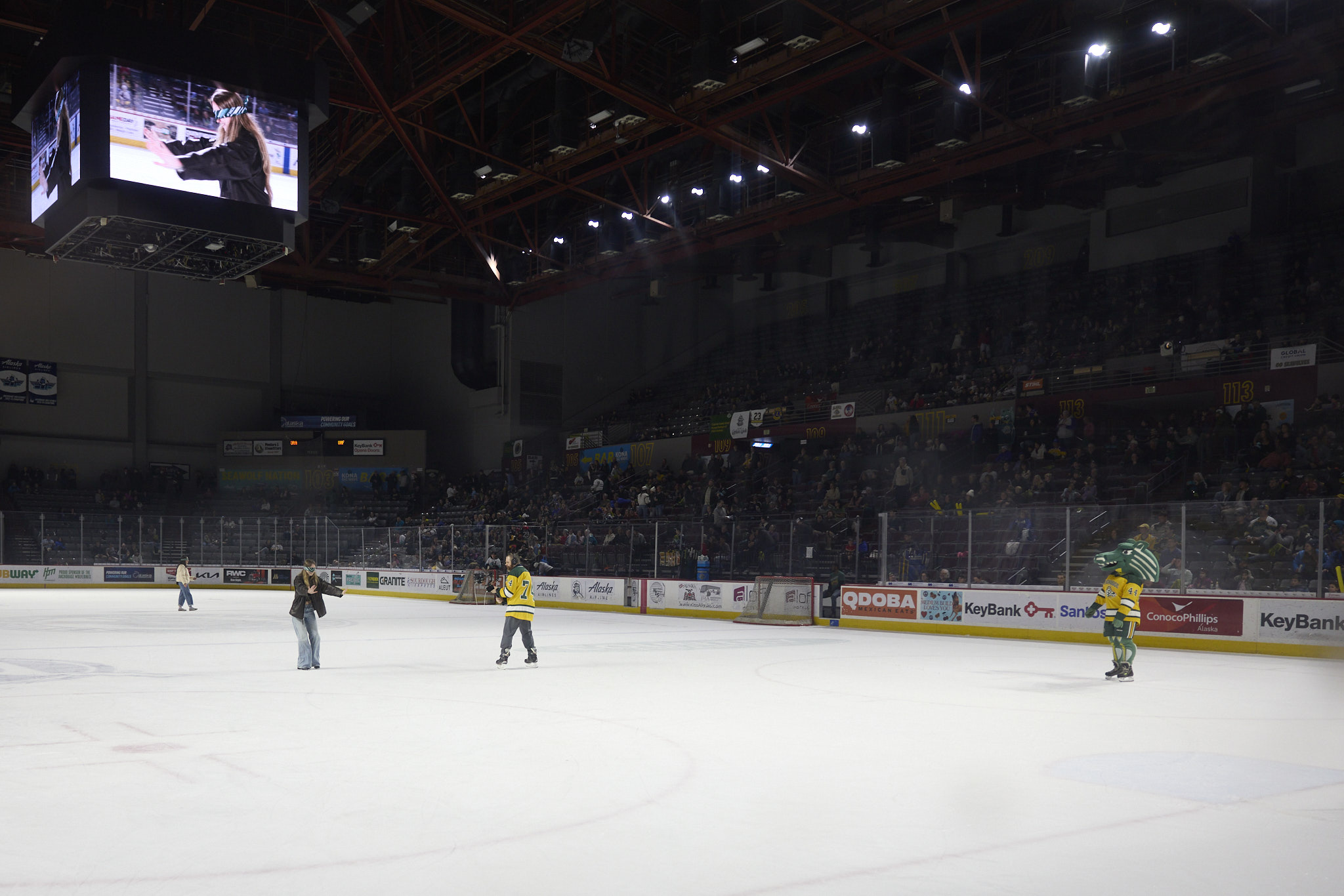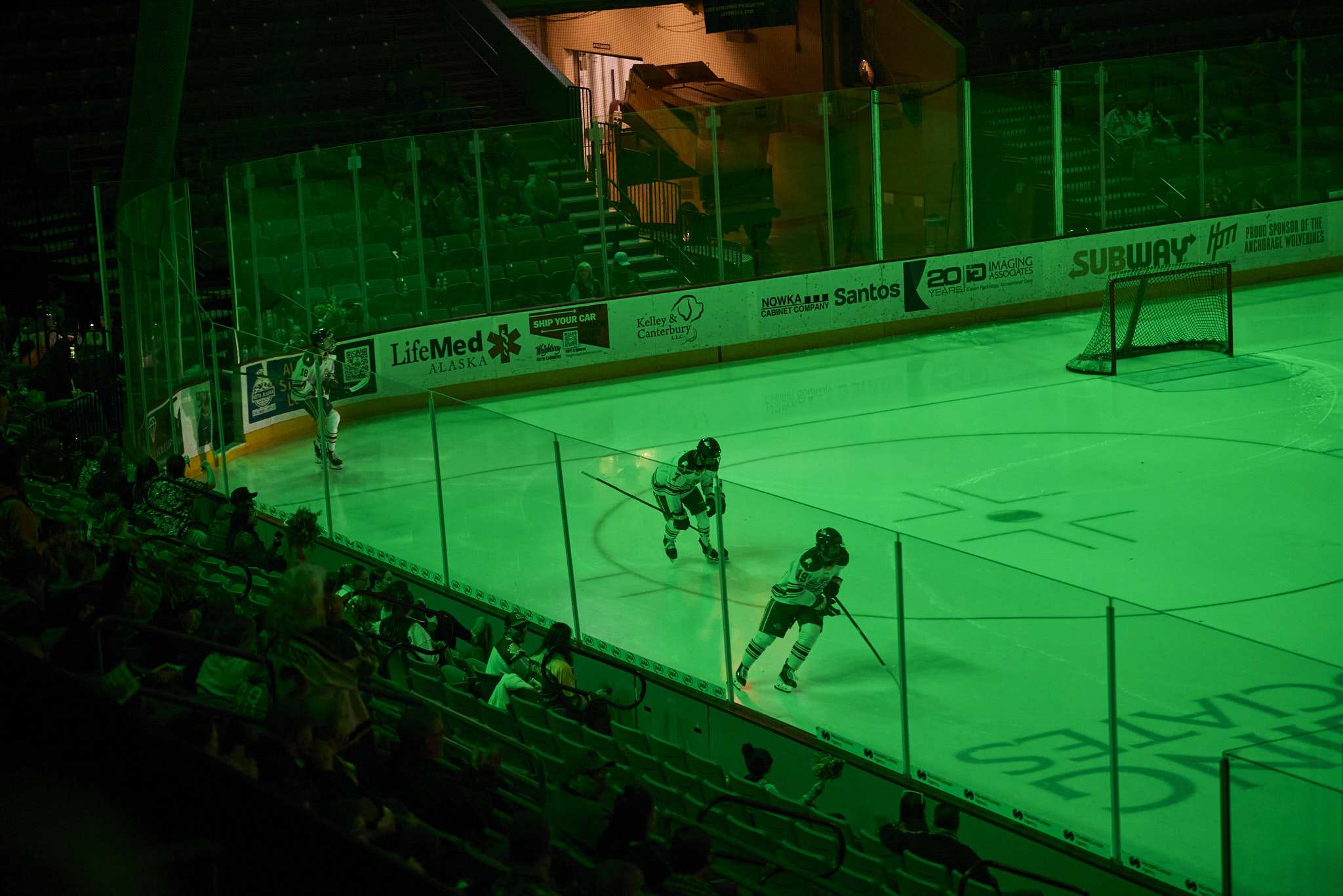 Sullivan Arena is lit up green as the Seawolves enter the ice. Photo by Justin Cox.