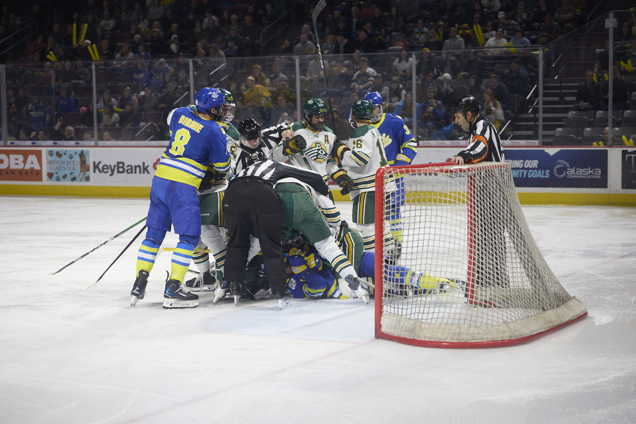 Referees break up a fight between UAA and UAF. Photo by Justin Cox.