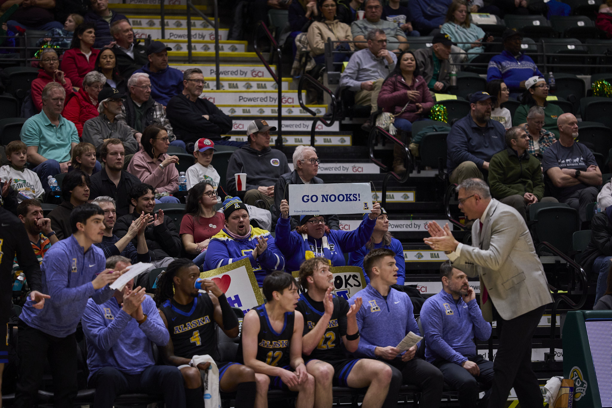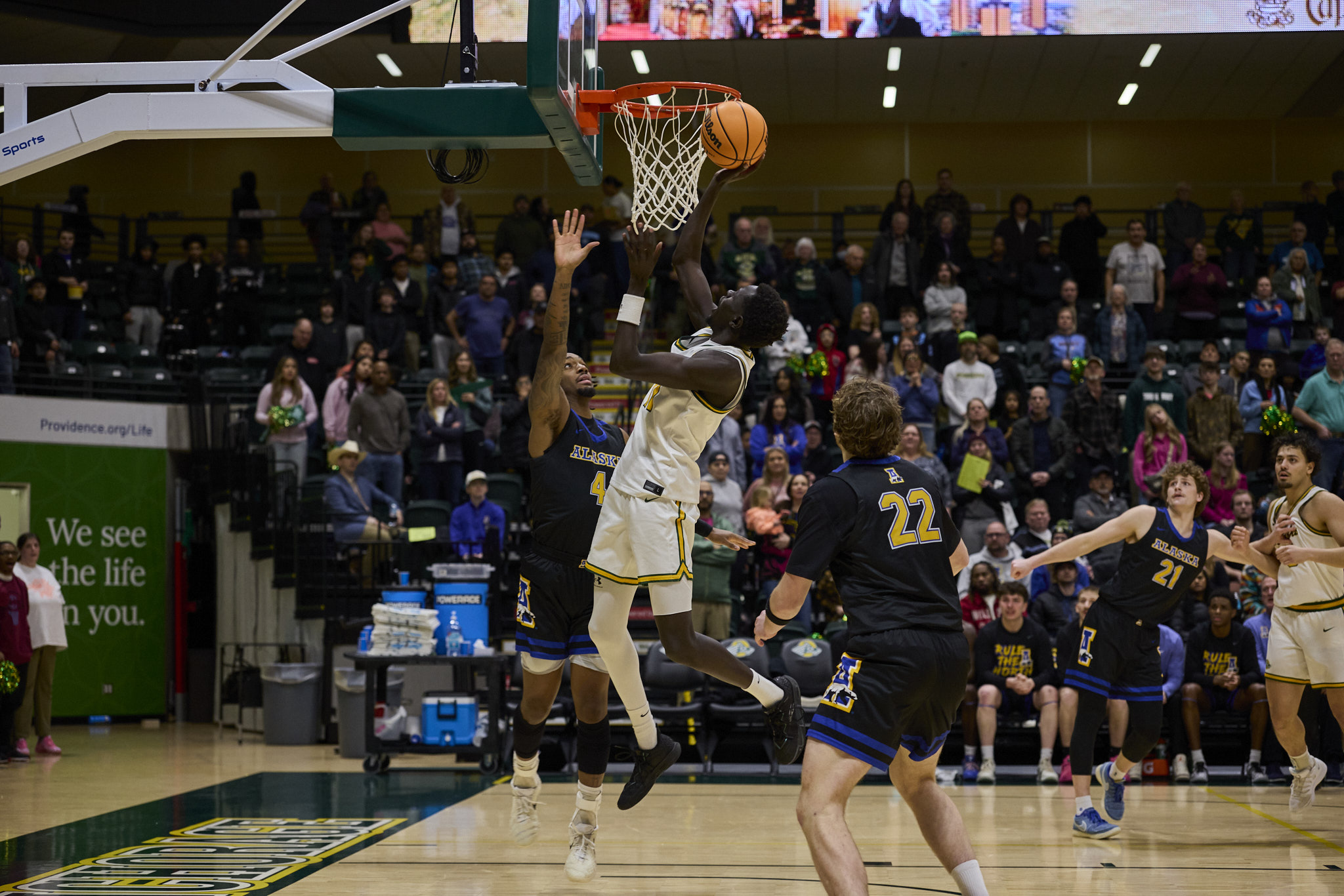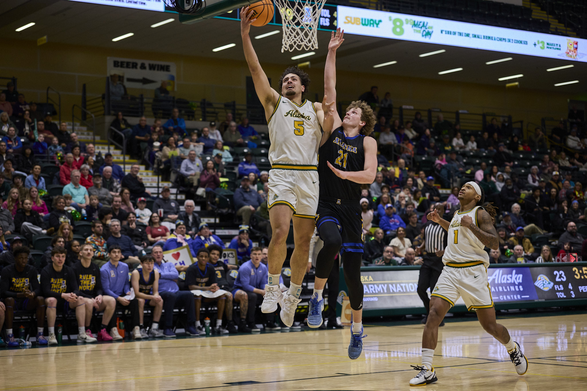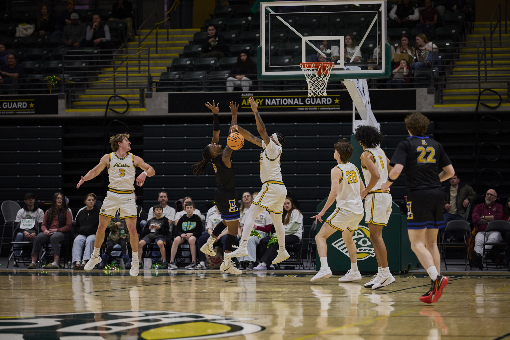 The Seawolves defeated the University of Alaska Fairbanks Nanooks 70-54, on Feb. 14. Sylas Williams’ 19 points and Hasaan Herrington’s 17 points, helped propel the Seawolves to victory. During halftime, fans threw soft donation items onto the court to support those in need in the local Anchorage community.
