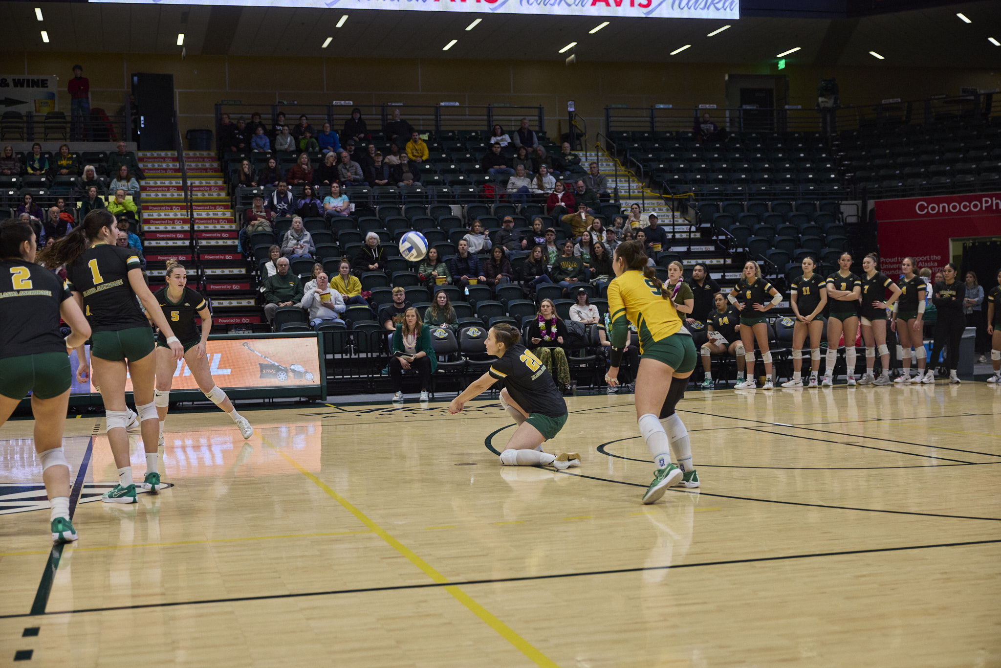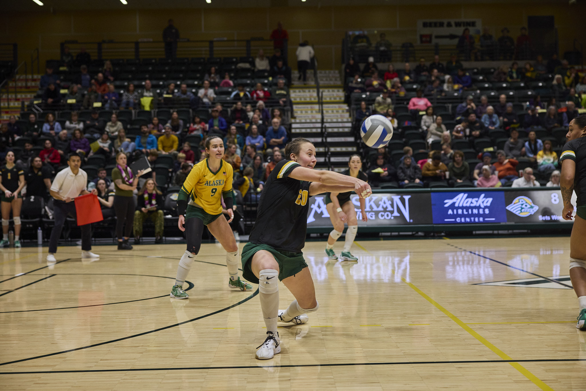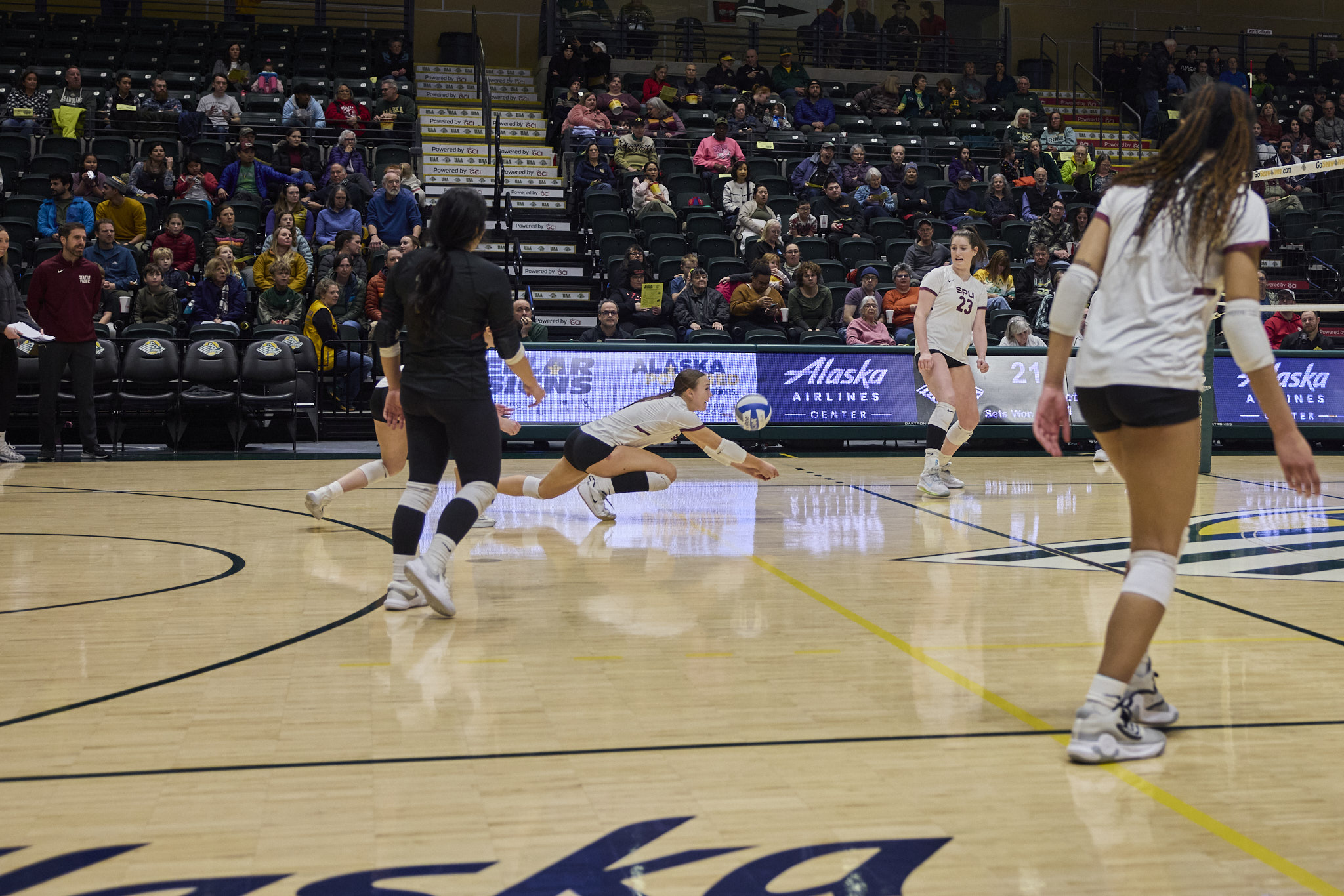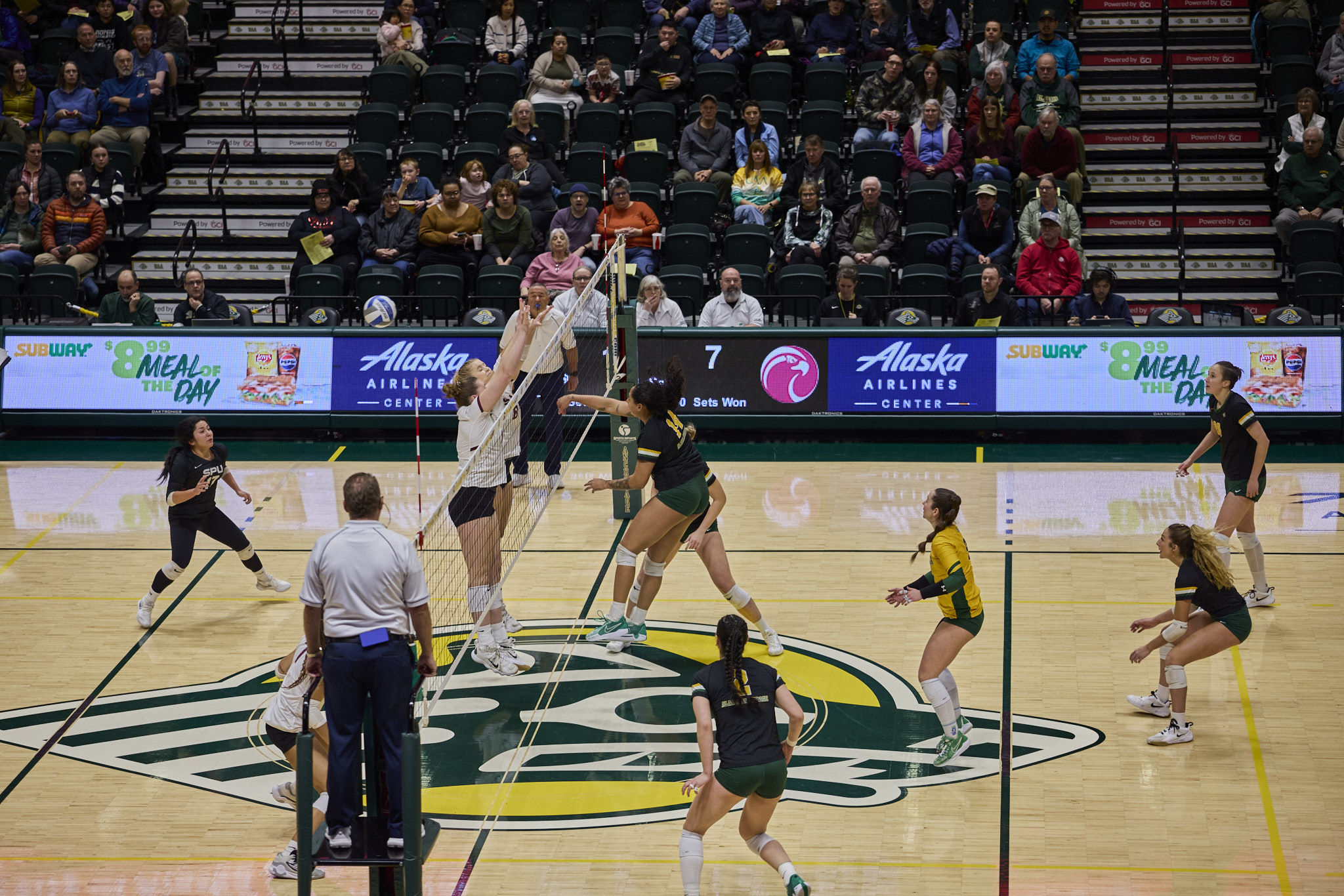 The Seawolves hit the first set hard, quickly amassing a 15-2 lead before the Falcons rallied back to end the set 25-17. The Seawolves seemed to be running out of steam, when in the second set, they traded points against the Falcons, barely holding the lead to finish the set 25-23. The Falcons rallied back in the third set, quickly getting a 6-0 lead over the Seawolves who rallied back, but lost the set 26-24. The loss of the third set rallied the Seawolves, who dominated the fourth set with a 25-15 victory. The Seawolves ended the season 23-5 overall and 14-4 in the GNAC.