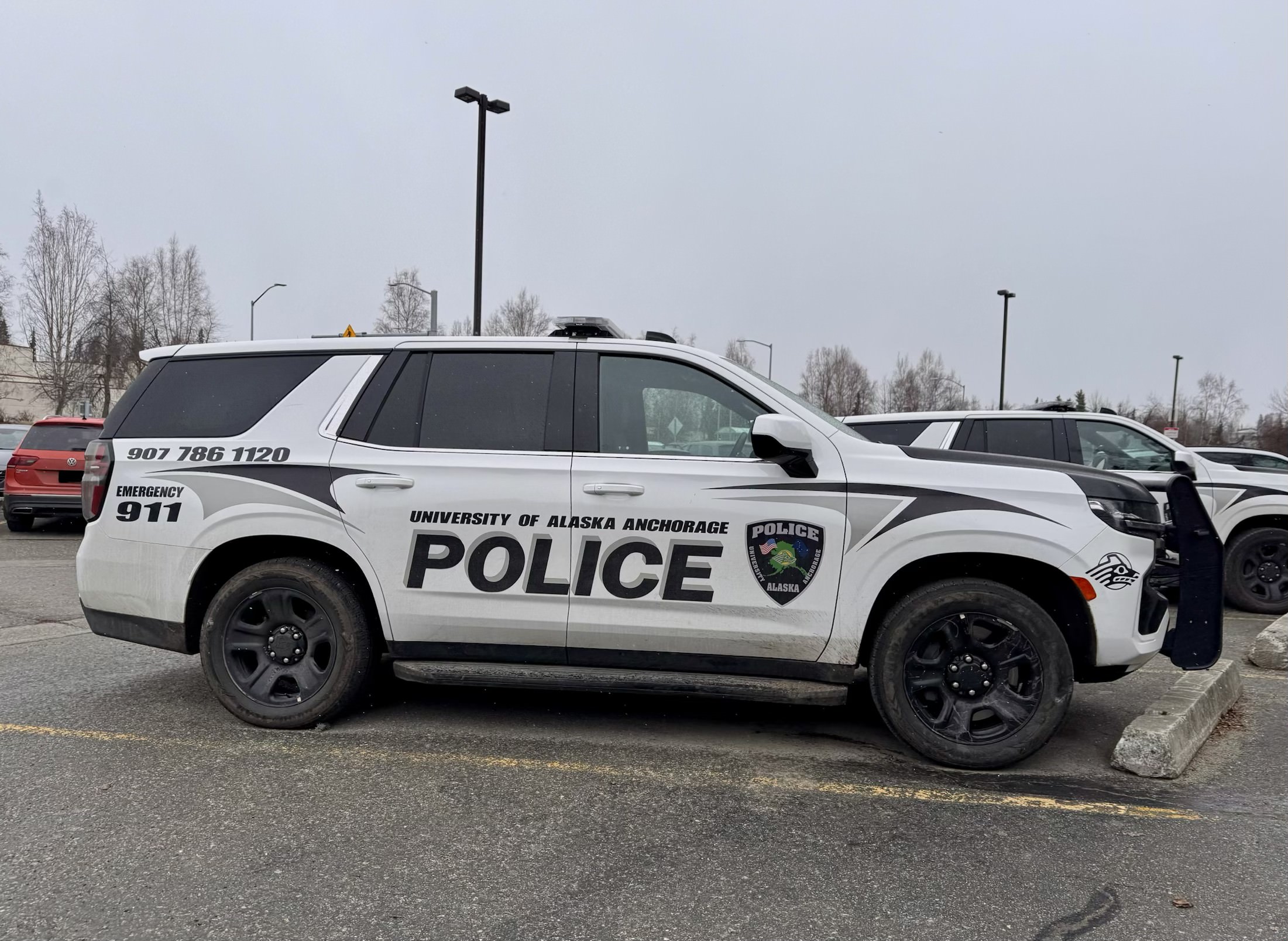 A University of Alaska Anchorage Police vehicle parked at the Eugene Short Hall. Photo by Murat Demir.