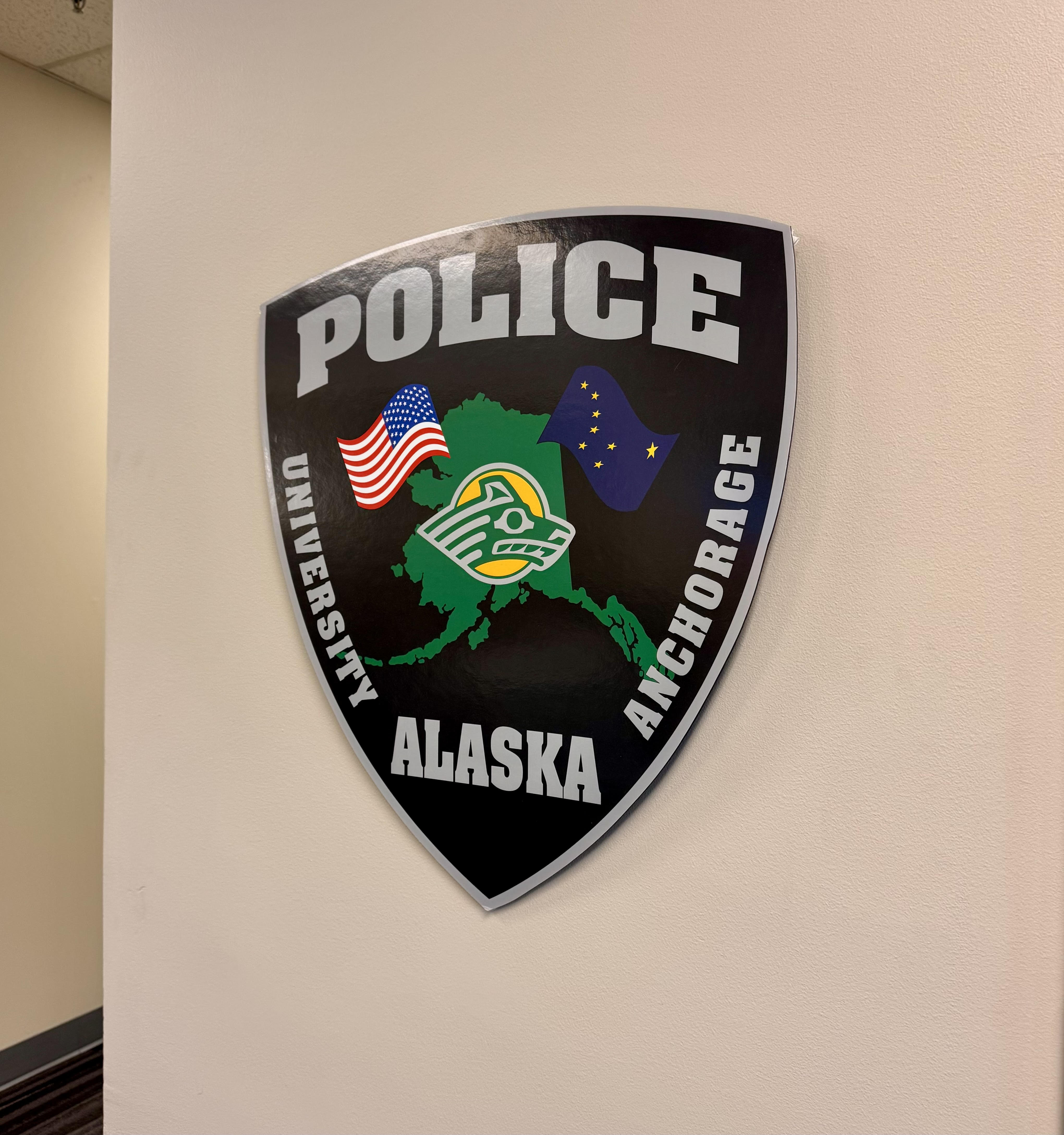 University of Alaska Anchorage Police emblem displayed on a wall at the Eugene Short Hall. Photo by Murat Demir.